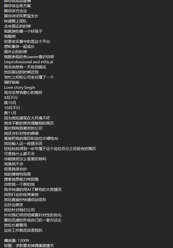 我这次爬的字幕为某个求职知识类UP主的视频字幕,他讲的内容有意义但非常碎片化。于是就产生导出字幕做成知识库的想法。最终脚本运行结果单个文件如下: