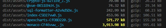 有些教程(官方也这么教)会教直接用import * as monaco from 'monaco-editor';来将整个依赖库导入,这样的后果就是打包出来的Monaco整整占用4MB(左图),而我们按需导入后体积骤降2.5MB(右图)