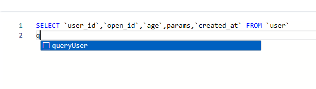 然后136行,我们自定义了一个片段,用于快捷输入我们常用的SQL片段,设置完成后我们可以通过输入queryUser来快捷使用SQL片段。片段中使用了${1:user_id}这种代表插槽,用户可按Tab键快速切换到下一个插槽中填数据,如果不填就使用插槽内部默认的字段,非常的方便